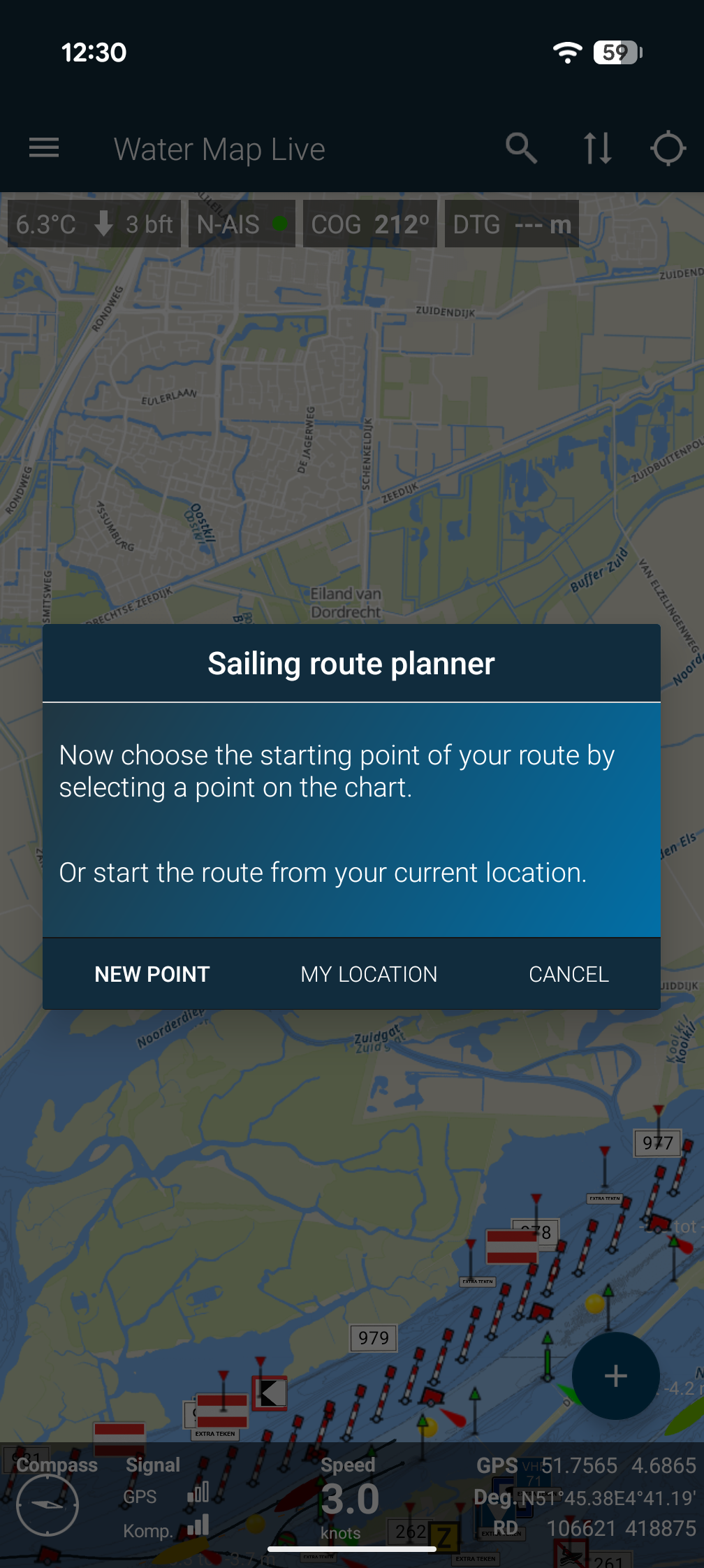 After you have planned the second point, you can choose: do you want to plan more waypoints to complete a route via a specific waterway? Or do you just want to see the route between the two points you marked on the map? In the window you now see, choose the corresponding options via the buttons at the bottom: New point or Plan route.