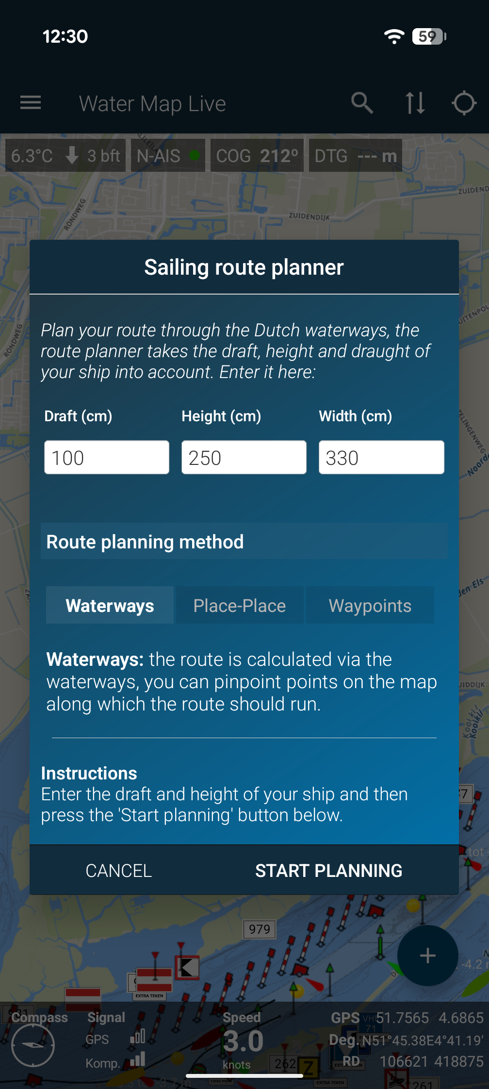 The route planner takes into account the height of bridges on your route and the depth of the waterway. To do this, you must enter the draft and height of your ship in the window you now see. If you have previously created an account or are logged in (see below), these details have already been filled in for you. Handy!