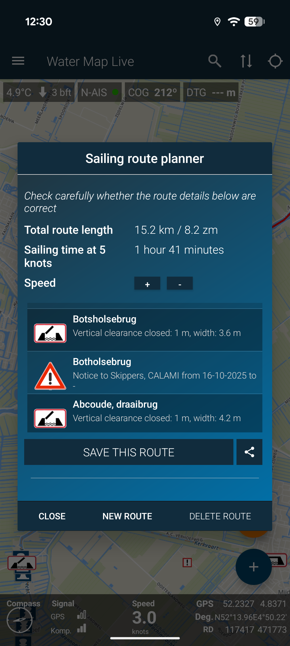 If you selected the 'Plan Route' option in the previous window, the app will calculate the route for your ship. Make sure that your device currently has an internet connection: the calculation is done by the watermaplive.net server. Once the route has been calculated, it is saved on your device and you can always view it later without internet. The route remains visible on the Water Map until you delete it yourself.