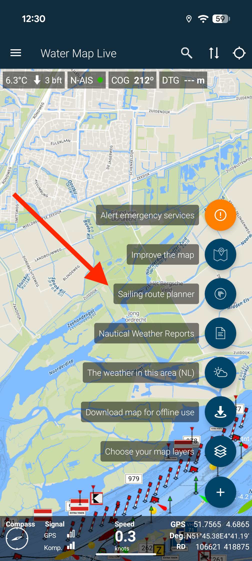 You start the route planner from the Water Map Live app. On the main screen you will see a round button at the bottom right, press it and a menu with many useful functions will appear, click on the 'Sailing Route Planner' function to start it (see the red arrow in the image below.)